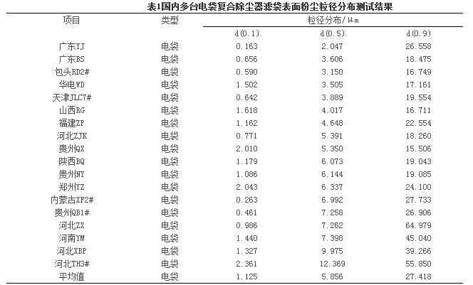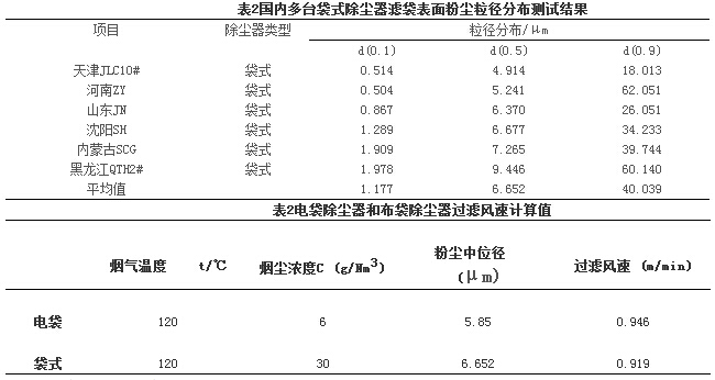 火电厂当前常用的袋式除尘器主要由电袋复合除尘器和纯袋式除尘器,这两类除尘器区别主要为进入袋区的烟尘浓度、烟尘粒径不同。朴华科技对国内多个火电厂数十台套的电袋除尘器和袋式除尘器滤袋表面粉尘粒径进行分析,结果如表1、表2上所示。